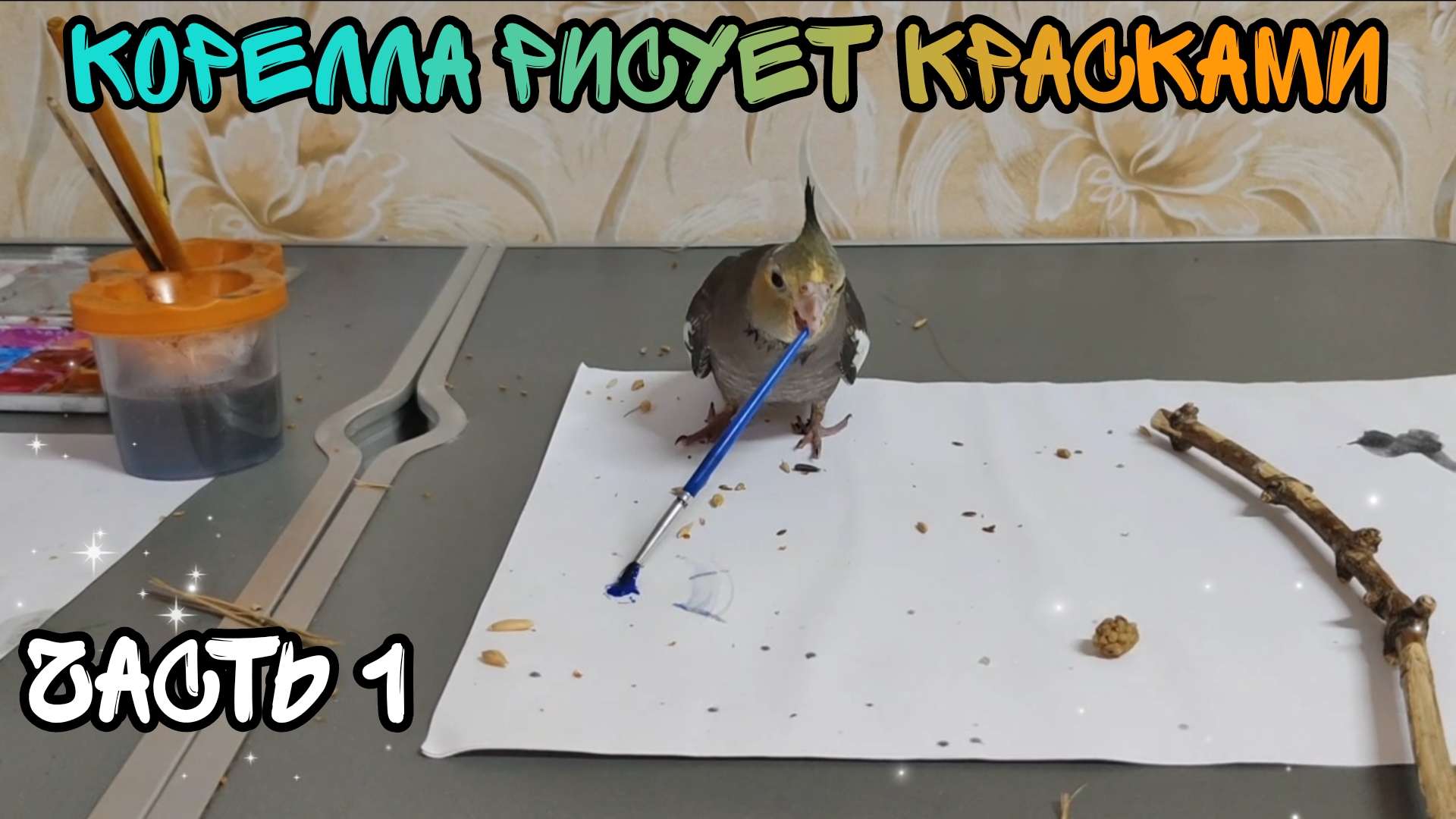 Попугай корелла рисует красками. Часть 1