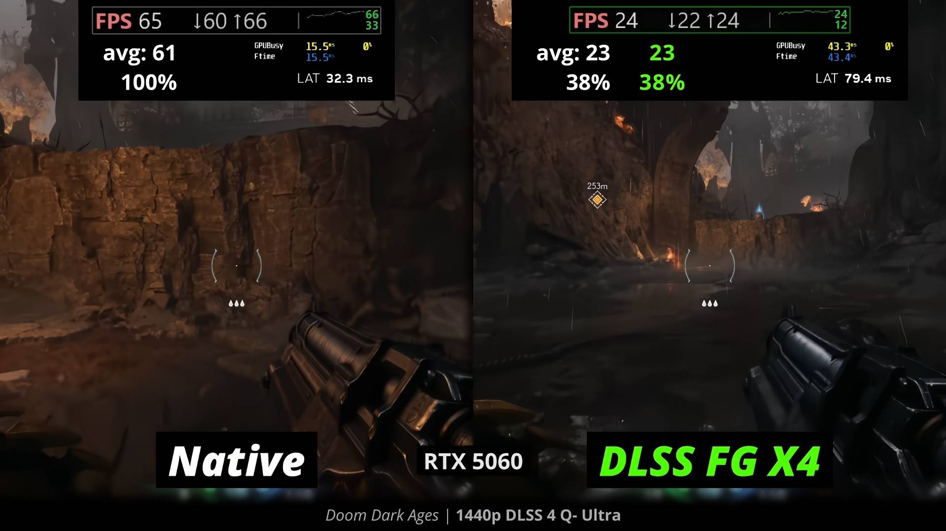 Генерация кадров DLSS 4 MFG на 5060 УМЕНЬШАЕТ реальною частоту кадров более, чем вдвое.