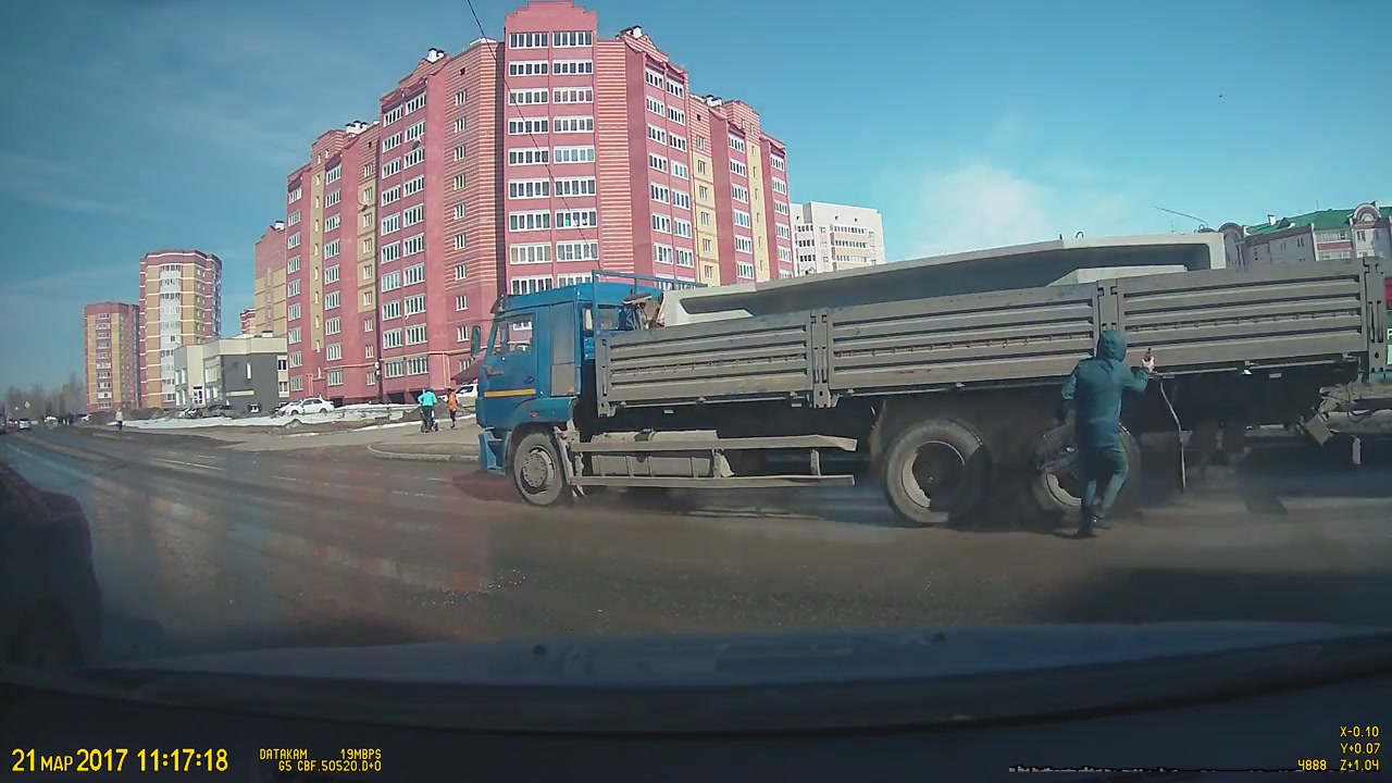 Госпитализацией закончилась для невнимательного жителя Зеленодольска попытка перебежать дорогу перед грузовиком. Что именно вынудило молодого человека спешно покинуть супермаркет «Магнит» на улице Королева, история умалчивает, но в 11:17 в минувший вторник, 21 марта, он в буквальном смысле ринулся через проезжую часть, не обращая внимания на автомобили и отсутствие перехода. Разогнавшись, покупатель с корзиной продуктов и пивной бутылкой в руках не успел остановиться перед грузовым автомобилем. На кадрах видно, как молодой человек буквально врезался в борт тяжелого автомобиля, после чего прицепом его отбросило на проезжую часть. «Дышит, дышит, нормально все», — успокоил своего приятеля владелец регистратора, он же вызвал на место скорую помощь. Пострадавшего госпитализировали, о дальнейшей его судьбе ничего не известно, хотя автор записи утверждает, что он остался жив.