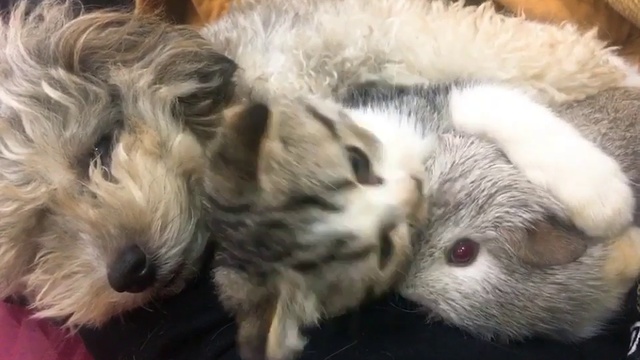 Чистая дружба между этой собакой, кошкой и милой маленькой морской свинкой. Они часто спят и играют вместе, как близкие друзья.