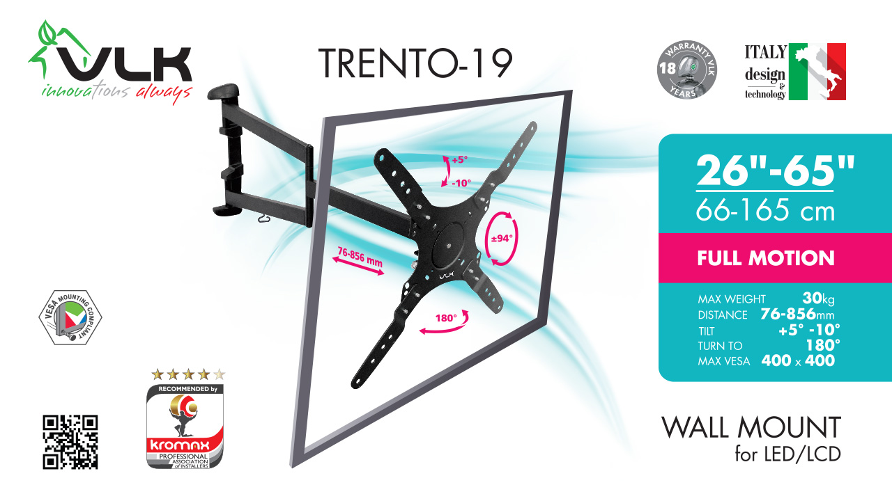 VLK TRENTO-19 BLACK надёжно удержит экран размером 26"-65" дюйма и весом 30 кг. Простая конструкция VLK TRENTO-19 BLACK идеально подойдет для самостоятельного монтажа. Наклонно-поворотная регулировка позволит наклонять вверх и вниз на +5 -10°, поворачивать влево и вправо на 180°, и выдвигать на 76-856 мм. Кронштейн подходит для большинства телевизоров популярных брендов, таких как Samsung, LG, Sony, Panasonic, Sharp, Toshiba, KIVI, Xiaomi Mi, SUPRA, Hyundai, Erisson, Horizont, JVC, Thomson, HAIER, BBK, Витязь, Веко, BQ, OZON, SkyLine, Pioneer, Philips, Rolsen, Harper, Hisense, Hitachi, Polarline, Prestigio и других. Крепёжные отверстия VLK TRENTO-19 BLACK изготовлены по стандарту VESA. В комплектацию VLK TRENTO-19 BLACK входят необходимые для монтажа материалы. Вся продукция обеспечивается гарантийными обязательствами. 18 лет гарантии на все сварные и механические соединения позволит наслаждаться конструкцией долгий срок. Во время эксплуатации VLK TRENTO-19 BLACK демонстрирует поразительную износостойкость и безотказность. Подробнее https://www.kromax.ru/produce/pan_tilt/6414/