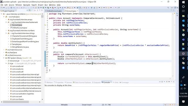 This video describes implementing the Comparable interface for custom classes and how we can use the custom classes for sorting in Collection framework for default sorting(without Comparator) ------------------------------------------------------------------------------------------------------------------------- #java #javainterview #comparable #sorting ------------------------------------------------------------------------------------------------------------------------- Github Link : https://github.com/FourStackDev/java-interview-problems