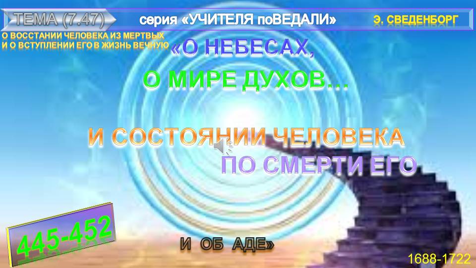 ч.2-пп.445-453-Книга О НЕБЕСАХ, О МИРЕ ДУХОВ И ОБ АДЕ-часть 2. - О ВОССТАНИИ ЧЕЛОВЕКА ИЗ МЕРТВЫХ И О ВСТУПЛЕНИИ ЕГО В ЖИЗНЬ ВЕЧНУЮ -Эммануила Сведенборга (1688-1722), Знаменитый теософ и мистик Эммануил Сведенборг в этом самом содержательном и любопытном своем труде изложил полученные им Знания посмертного существования, описывая различные Божественные Высшие, Ангельские Тонкие и иные миры, а также их Обитателей, включая мир Ада... Е.П. Блаватская высоко ценила труды Э. Сведенборга, прежде всего как теософа, называя его великим провидцем. Данный Книга содержит записи автора, имеющие сквозную нумерацию от 1 по 360. Все записи сгруппированы и представлены по-порядку изложения в соответствующем их тематике подразделе." Книги "О НЕБЕСАХ, О МИРЕ ДУХОВ И ОБ АДЕ"-Эммануила Сведенборга. Знаменитый теософ и мистик Эммануил Сведенборг (1688—1722) в этом самом содержательном и любопытном своем труде изложил полученные им Знания посмертного существования, описывая различные Божественные Высшие, Ангельские Тонкие и иные миры, а также их Обитателей, включая мир Ада... Данный Книга содержит записи автора, имеющие сквозную нумерацию от 1 по 360. Все записи сгруппированы и представлены по-порядку изложения в соответствующем их тематике подразделе.