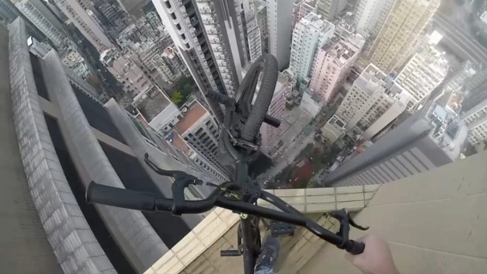 Велосипедист на парапете небоскреба