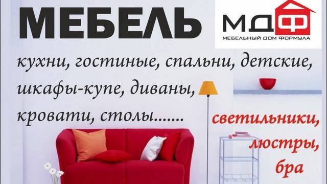 Компания "Мебельный Дом Формула" представляет лучшие образцы корпусной и мягкой мебели для вашего дома. Мы сотрудничаем с десятками поставщиков, что дает нашим покупателям самый широкий выбор качественной домашней мебели. У нас можно заказать и купить мебель на любой вкус при любых финансовых возможностях, здесь вы найдете всё, что вам может понадобиться для обустройства маленькой квартиры или большого дома. – Современные кухни создадут удобное и функциональное пространство для заботливой и умелой хозяйки. Есть готовая кухонная мебель, и по индивидуальному заказу. – Модный дизайн гарнитуров для гостиных сделает ваш дом желанным местом встреч родных и друзей. – Великолепные спальные гарнитуры наполнят дом любовью и покоем. – Красивая и безопасная детская мебель подарит радость и ребенку, и родителям. Также у нас вы можете выбрать отдельные предметы для домашней меблировки, в том числе кровати, диваны, кресла, столы, тумбы, пуфы, стенки, шкафы и шкаф-купе. Для наших клиентов мы делаем индивидуальные ДИЗАЙН-ПРОЕКТЫ по обустройству дома, проводим профессиональные замеры помещения. Сделаем встройку любой сложности и из любого материала. Кроме мебели наш интернет магазин предлагает широкий выбор бытовых ламп: светильники и торшеры, люстры и бра. С компанией "МДФ" ваш дом станет светлее и уютнее! Мебель от "МДФ" – заказы и доставка по всей России! Ленинградская обл., г. Луга, пр-кт Урицкого, дом 77 корпус 1 Тел.: 8 (981)-798-62-98 Часы работы магазина: Пн-Вс с 09:00 до 19:00 Группа ВКонтакте: vk.com/lugamebeldom В Интернете (в поисковиках) нас находят, в частности, по таким словам: корпусная мебель Луга, мягкая мебель Луга, светильники Луга, люстры Луга. #мебельЛуга #Луга #Лужскийрайон #Ленинградскаяобласть