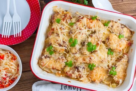 Свинина 500 гр Картошка 1 кг Мягкий сыр 150 гр Лук 2 шт. Майонез 150 гр Соль 1 чайн.л. Перец по вкусу