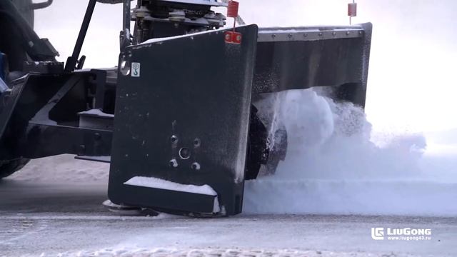 Погрузчик LiuGong CLG 385B чистит дорогу шнекороторным снегоуборщиком, уборка снега.