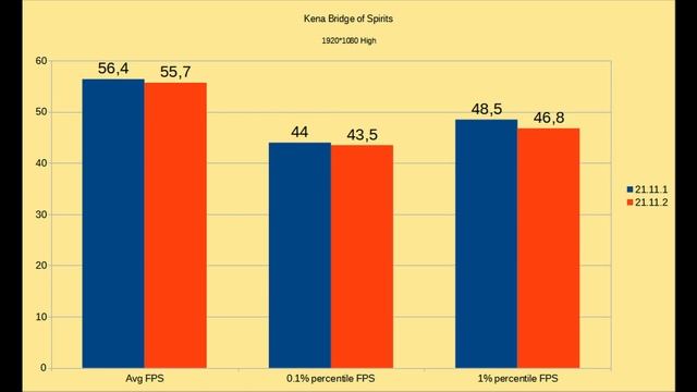 Did a little comparison between 21.11.2 and 21.11.1 System: CPU: 3700x non-oc GPU: RX 5500 XT 8 gigs non-oc Windows 10 with all updates till today. Method: I record the first run for the benchmark-szene and then i'm doing another three runs and calculcate the median of all three runs.