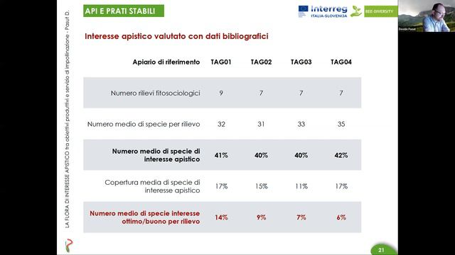 The flora of beekeeping interest between production objectives and pollination service. Relatori: Davide Pasut – Dottore forestale, libero professionista Moderatori: Stefano Bovolenta - Università degli Studi di Udine Antonella Stravisi - Polo Tecnologico Alto Adriatico di Pordenone Il relatore è un esperto di alpicoltura e profondo conoscitore degli ambienti prato-pascolivi montani. E’ consigliere dell'Ordine Dottori Agronomi e Dottori Forestali del Friuli Venezia Giulia, membro del Consiglio Direttivo della Società per lo Studio e la Valorizzazione dei Sistemi Zootecnici Alpini (SoZooAlp) e componente del Comitato Tecnico Scientifico del Parco Regionale della Lessinia. Il seminario si propone di indagare il rapporto tra api domestiche e piante da esse visitate per la raccolta di polline e nettare, anche in relazione ai risultati ottenuti nel progetto BeeDiversity. Non sempre le specie più interessanti per le api sono autoctone ed alcune hanno anche caratteri invasivi, fatto che contrasta con gli obiettivi di conservazione degli ambienti naturali, come quelli delle Aree Natura 2000. Queste considerazioni permettono interessanti riflessioni sulla convivenza tra obiettivi economici e conservazionistici, riportando alla luce tematiche troppo spesso eluse sul rapporto tra agricoltura, allevamento e gestione del patrimonio naturale. Il relatore espone il metodo individuato nell’ambito del progetto BeeDiversity per il monitoraggio della biodiversità vegetale dei prati stabili, che la Regione Friuli Venezia Giulia provvede da tempo a tutelare con la legge regionale n. 9/2005 e i primi risultati che mettono in relazione la presenza di flora di interesse apistico con il polline raccolto dagli apiari sperimentali posizionati nelle aree studio. - The speaker is an expert in mountaineering and profound connoisseur of mountain meadow-pasture environments. He is a director of the Order of Agronomists and Forestry Doctors of Friuli Venezia Giulia, a member of the Board of Directors of the Society for the Study and Enhancement of Alpine Zootechnical Systems (SoZooAlp) and a member of the Technical Scientific Committee of the Lessinia Regional Park. The seminar aims to investigate the relationship between domestic bees and plants they visit for the collection of pollen and nectar, also in relation to the results obtained in the BeeDiversity project. The species most interesting for bees are not always autochthonous and some also have invasive characteristics, a fact that contrasts with the conservation objectives of natural environments, such as those of the Natura 2000 areas. These considerations allow interesting reflections on the coexistence between economic and conservation objectives, bringing to light issues that are too often eluded on the relationship between agriculture, livestock and natural heritage management. The speaker explains the method identified as part of the BeeDiversity project for monitoring the plant biodiversity of stable meadows, which the Friuli Venezia Giulia Region has been protecting with regional law no. 9/2005 and the first results that link the presence of flora of beekeeping interest with the pollen collected from the experimental apiaries located in the study areas.