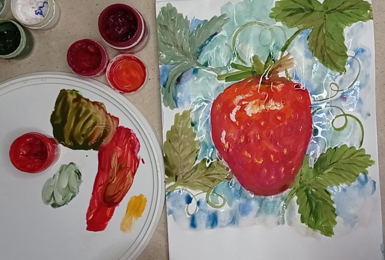 Приветствую, мои дорогие творческие друзья! Предлагаю вместе со мной нарисовать клубнику гуашью. Это простое рисование для начинающих. Картинка получается яркая, ей вполне можно украсить, например, холодильник на кухне, или сделать открытку для тех, кто родился летом =)