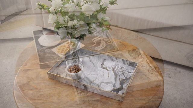 Набор из двух прямоугольных подносов, выполненных в классическом стиле с золотистыми деталями и отделкой под мрамор, обновит традиционный интерьер своим современным видом.