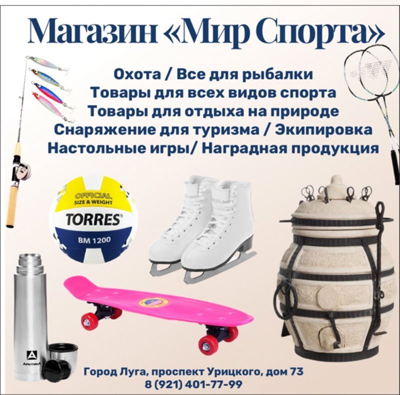 "Мир спорта" - магазин спортивных товаров в Луге. Магазин "Мир спорта"- это большой выбор товара для спорта, туризма, охоты и рыболовства. В нашем ассортименте более 20 тысяч наименований товаров. Система накопительных скидок, возможность приобретения товара в кредит и рассрочку. Ленинградская область, г. Луга, проспект Урицкого, д. 73 Телефон 8 (921) 401-77-99 В Интернете (в поисковиках) нас находят, в частности, по таким словам: магазин спортивных товаров Луга. #магазинспортивныхтоваров #Луга #Лужскийрайон #Ленинградскаяобласть #спортивныетовары