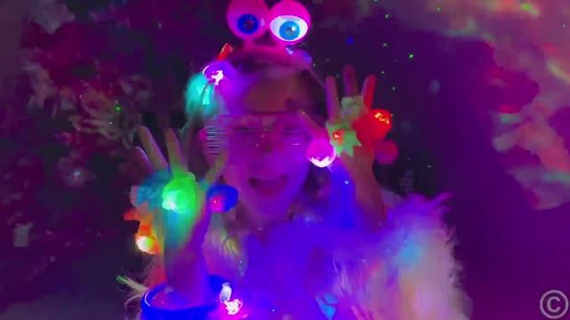 Настя и папа играют с тенями и светящимися игрушками.