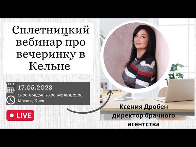 у нас сплетницкий вебинар в прямом эфире: я расскажу вас о том, как прошла вечеринка в Кельне, и чем мои гости опять меня удивили Так же я представлю вам анкеты кавалеров, которые сейчас в актуальном поиске. И расскажу про наш рождественский проект – «Королевские выходные в замке» Мы встречаемся в среду, 17 мая 2023 г. Время: 19.00 по Лондону, 20.00 по Берлину, 21.00 по Москве, Киеву, Минску Место встречи: пройдет на нашем канале YouTube Ksenia Droben https://www.youtube.com/@KseniaDrobenPartnervermittlung На странице Facebook https://www.facebook.com/ksenia.droben VK https://vk.com/kseniadroben Буду рада увидеться с вами Наши ближайшие мероприятия: 21 мая - «Круглый стол», онлайн, zoom - https://bridespb.com/ru/vstrecha-lubov/ 17 июня – вечеринка знакомств в Берлине https://droben-partnervermittlung.de/ru/dating-vecherinka-berlin/ 8 июля - вечеринка знакомств в Мюнхене https://droben-partnervermittlung.de/ru/vecherinka-dating-munchen/ Последняя серия нашего репортажа о знакомствах прошла в фотостудии – Алекс и Николай познакомились с Наталией и Дарьей во время фотосессии. Нравится ли вам такая идея? Напишите, пожалуйста, ваше мнение в комментариях под видео https://youtu.be/Pss5ZTVaydY