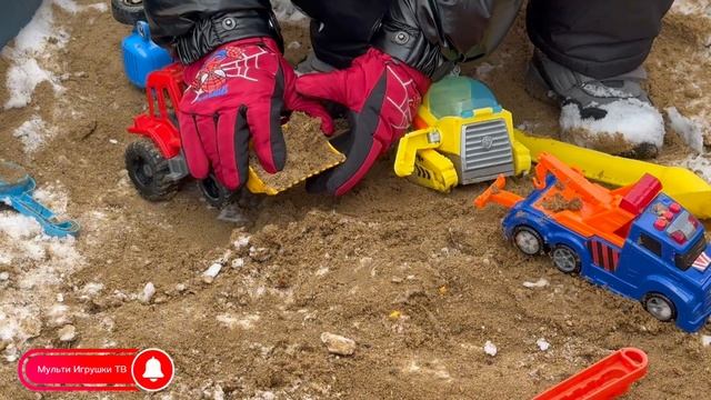 Руслан играет в песочнице с машинками