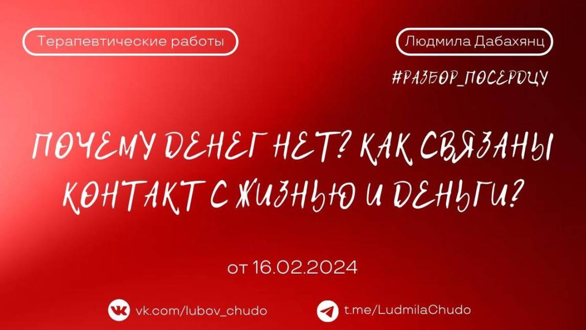 Терапевтическая работа #разбор_поСердцу Про чувство ВИНЫ перед близкими за их частые болезни. ‼️ до встречи на следующей неделе, успевайте отправить заявку на участие в разборе, заявки на разбор принимаются лс - https://t.me/ludmiladbc Провела беседу: #просто_волшебница психотерапевт, целитель ЛЮДМИЛА ДАБАХЯНЦ Канал https://t.me/LudmilaChudo ‼️ канал #ТВОРЕЦ_СВОЕЙ_РЕАЛЬНОСТИ Подробнее: https://rutube.ru/plst/366415 2024 руб/месяц Заходите в бот - https://t.me/ludmiladbc_bot , если хотите участвовать ✓ Обязательно поставь 💗 ✓ Подпишись на канал ✓ И поделись с близкими Это будет вашим балансом за движение и получение энергии. Если есть желание создать баланс брать-давать... приму от всего сердца с благословением (донейшн) С Огромной Любовью, Дабахянц Людмила 💓 ✨ Telegram: https://t.me/ludmiladbc ✨ Канал в telegram “Я ЕСТЬ ТО, ЧТО Я ЕСТЬ”: https://t.me/LudmilaChudo ✨Онлайн-школа: https://ludmilachudo.skillspace.ru/school