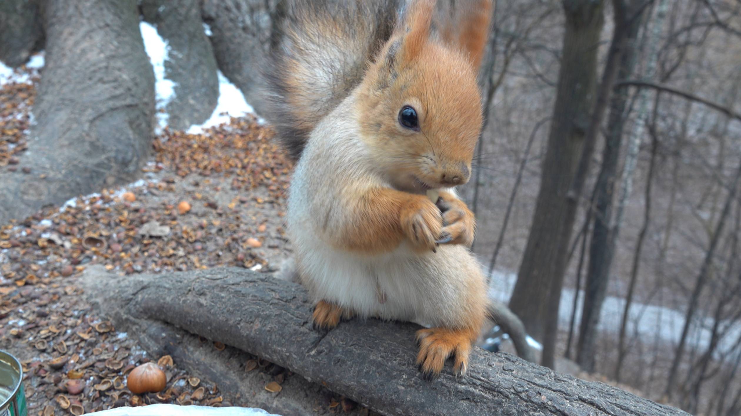 Голодная рыжая белка и голуби. Зарисовка