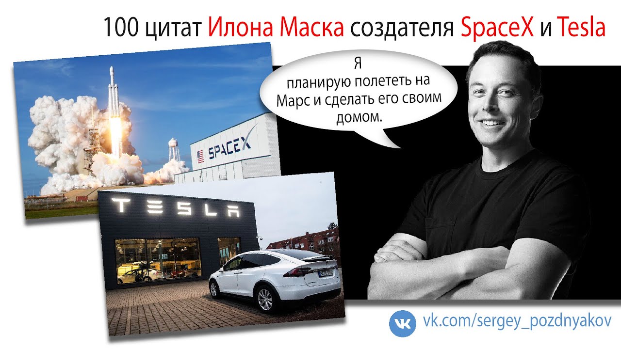 100 цитат Илона Маска создателя SpaceX и Tesla Сегодня я расскажу вам об Илоне Маске, предпринимателе, инженере и МИЛЛИАРДЕРЕ. - Основатель, совладелец, генеральный директор и главный инженер компании SpaceX - Генеральный директор и главный идейный вдохновитель компании Tesla - За выдающиеся заслуги перед наукой 9 мая 2018 года удостоен членства Лондонского королевского общества - 7 января 2021 года, с состоянием по оценочным данным в 185 млрд $, впервые стал богатейшим человеком планеты, сместив на второе место основателя Amazon Джеффа Безоса - 1 ноября 2021 года стал первым человеком в истории, чьё состояние достигло отметки в 300 млрд $ - Человек года по версии журнала «Time» (2021) - Подписывайтесь на мой канал в YOUtube https://www.youtube.com/channel/UCQBy3iEELc0ltPAt_gkCkOQ - Я в Rutube https://rutube.ru/channel/26552914/ - Я VK https://vk.com/sergey_pozdnyakov - Я в ОК https://ok.ru/group51148294651980 - Я в Яндекс Дзен https://zen.yandex.ru/id/608c778a1f08643617f9a192 - Я RUS https://vk.com/away.php?utf=1&to=https%3A%2F%2Fyarus.ru%2Fu%2F7244001 - Моя БИБЛИОТЕКА https://vk.com/market-11000336?section=album_1 - #ИлонМаск #SpaceX #Tesla #МИЛЛИАРДЕР #деньги #какстатьбогатым #финансы #бизнес #финансоваяграмотность