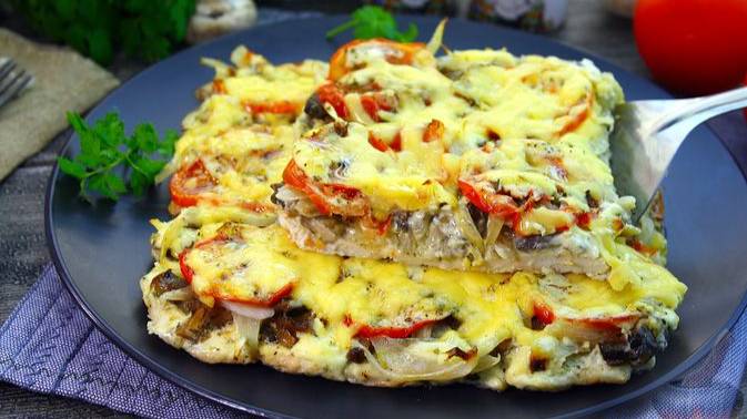 Куриное филе, запечённое под слоем нежных грибов, свежих помидоров и сыра, получается сочным и ароматным. Отличный выбор для ужина в кругу семьи, праздничного стола или романтического вечера. #КурицаСГрибами #КурицаССыром #КурицаСПомидорами #КурицаВДуховке