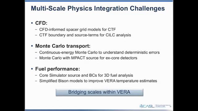 CASL is the first U.S. Energy Innovation Hub connecting fundamental research and technology development through an integrated partnership of government, academia, and industry. CASL’s objective is to provide leading edge modeling and simulation (M&S) capability to improve the performance of currently operating light water reactors and its vision is safer and more productive commercial nuclear power production afforded through comprehensive science-based predictive M&S technology. Towards that end, CASL is developing the Virtual Environment for Reactor Applications (VERA). VERA software simulates nuclear reactor physical phenomena using coupled multi-physics models and includes a range of physical domains, from microscale to engineering scale. VERA's current physics capabilities include neutron transport, thermal-hydraulics, fuel performance, and coolant chemistry.