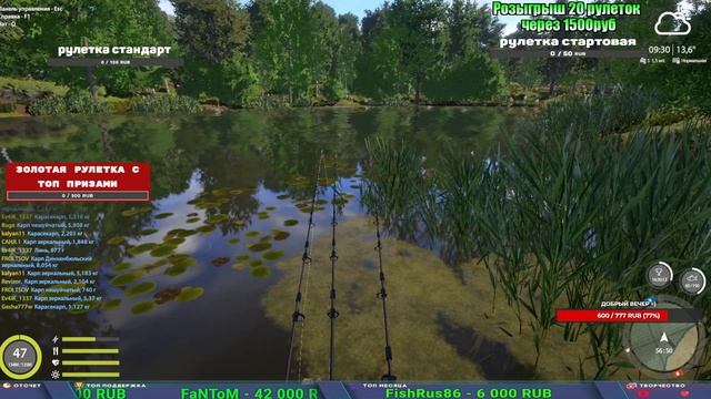 Поддержка донатом https://new.donatepay.ru/@1032463 Альтернативный донат https://www.donationalerts.com/r/kalyamba11 5536913964533059 карта Тинькоф Если стрим лагает,смотри стрим на трово https://trovo.live/s/Kalyamba_na_Ribalke Мой ВК - https://vk.com/kalyantv НИК в игре kalyan11 НАШ ДИСКОРД СЕРВЕР https://discord.gg/pFsEn9e9 Заказ водоема на 1 час - 500р ( весь стрим 2500р ) Модерка на канале 1200р ( каждая следующая на 100р больше) Озвучка доната на 40р,50р,100р,200р,300р,500р,1000р ✅Призы в рулетке "ЗОЛОТАЯ" ✔ ЗОЛОТО ✔ ПРЕМ ✔ КАТУШКИ ЮБИЛЕЙНАЯ БОРЕЛИКА, ВЕНГИ, ТАЙГА, СИЛЬВЕР 80, И другие ✔ ПАЛКИ ПИЛКЕРНАЯ, ДОНКА МОРСКИЕ, ✔ РОД ПОД, СТУЛЬЯ ✅Призы в рулетке СТАНДАРТ : ✔ катушкИ ЮБИЛЕЙНАЯ БОРЕЛИКА, ВЕНГИ, ТАЙГА, СИЛЬВЕР 80, И другие ✔ катушки 60 для медного ( ЭВИИ, НАТОРЫ, ГОЛДА, и тд) ✔ ПИЛКЕРНОЕ УДИЛИЩЕ КОРОЛЕВА ОКЕАНА ✔ Морское Донное удилище ✔ прем ( 3, 7, 30 дней) ✔ золото ( 1, 3, 5, 10, 20 ,50) ✔ билет на море ( 1, 3, 5 дней) ✔ голд наживка и др. ✅Призы в рулетке "СТАРТОВАЯ" ✔ катушка "silver80" ✔ катушка "БЕЛЫЙ КАЛИБР" ✔ катушка "Черный калибр" ✔ катушка "Протон" ✔ катушка "Нарга 6000" ✔ Набор Фидерист и спинингист ✔ Карповик Фортуна ✔ фидерные удилища ✔ прем, золото, алкашка, наживки и тд P.s Рулетка это не казино, а награда за поддержку стримера. Вечный ТОП ПОДДЕРЖКИ (11.05.2024) 1. Dimon_pokemonchik 119 784 2. Interceptor 75 508 3. Skreb79 71 261 4. une personne 68 619 5. Нарвал77 31 550