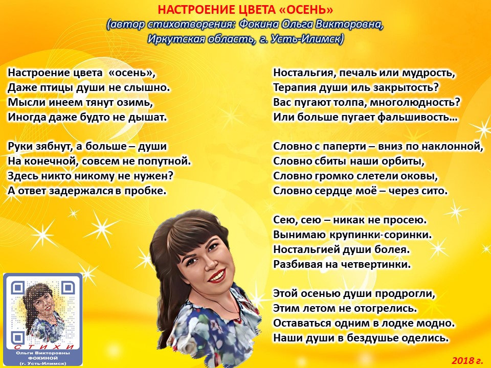 Читает автор стихотворения: ФОКИНА ОЛЬГА ВИКТОРОВНА (Иркутская область, город Усть-Илимск) СТИХИ: https://stihi.ru/2018/07/08/3790 БИОГРАФИЯ: http://www.proza.ru/2019/10/08/1473 ВЫИГРЫВАЙТЕ КНИГИ БЕСПЛАТНО: https://proza.ru/2017/09/17/447 ОТЗЫВЫ ЧИТАТЕЛЕЙ: http://www.proza.ru/2019/11/29/611 Из книги Фокиной Ольги Викторовны (Усть-Илимск) «Несу добро в ладошках!»: [все стихотворения с 2005 по октябрь 2020 гг., проза, авторские песни, интервью]. – Москва: МГО Союза писателей России, 2020 г. – 886 стр., ил. ISBN 978-5-7949-0826-8 НАСТРОЕНИЕ ЦВЕТА «ОСЕНЬ» (автор стихотворения: Фокина Ольга Викторовна, Иркутская область, г. Усть-Илимск) Настроение цвета «осень», Даже птицы души не слышно. Мысли инеем тянут озимь, Иногда даже будто не дышат. Руки зябнут, а больше – души На конечной, совсем не попутной. Здесь никто никому не нужен? А ответ задержался в пробке. Ностальгия, печаль или мудрость, Терапия души иль закрытость? Вас пугают толпа, многолюдность? Или больше пугает фальшивость… Словно с паперти – вниз по наклонной, Словно сбиты наши орбиты, Словно громко слетели оковы, Словно сердце моё – через сито. Сею, сею – никак не просею. Вынимаю крупинки-соринки. Ностальгией души болея. Разбивая на четвертинки. Этой осенью души продрогли, Этим летом не отогрелись. Оставаться одним в лодке модно. Наши души в бездушье оделись. 2 октября 2018 г.