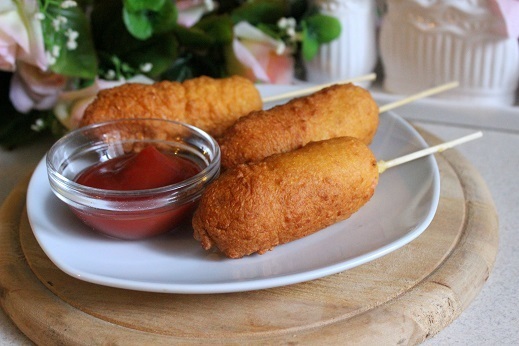 Сосиска — 10 шт. Кукурузная мука — 6 ст. л. Пшеничная мука — 2 ст. л. Разрыхлитель теста — ½ ч. л. Соль — по вкусу Молоко — 150 г Куриное яйцо — 2-3 шт. Растительное масло — 1 ст. л. + для фритюра Мед — 1 ч. л. Приготовление: Соедините все компоненты, кроме сосисок. Взбейте до образования густого теста. Нанижите сосиски на шпажки. Обмакните в тесто. Обжарьте во фритюре до румяной корочки. Подавайте с соусом.