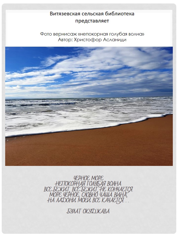 С тех пор как человек впервые увидел море, прошли многие тысячи лет. И всё это время он не перестаёт удивляться его переменчивому нраву. Море может быть безмятежным, но нередко проявляет крутой нрав и обрушивает свой гнев на сушу. «… в те времена — это море было недоступно для плавания и называлось «Аксинским» из-за зимних бурь и дикости окрестных племён, особенно скифов. Впоследствии, после основания ионянами городов на побережье, это море было названо «Евксинским» … Греческий историк и географ Страбон, «География», I до н.э. Там, где постоянно грохочет прибой, облик морских берегов меняется буквально на глазах. Один сильный шторм способен поглотить солидный участок суши или намыть широкую полосу мелководья. И в этом нет ничего удивительного, так как здесь действуют поистине неукротимые силы природы. Волны и течения движут вдоль берегов гигантские объёмы песка и создают из них самые причудливые формы берегового рельефа. «Очертания Понта напоминают сильно изогнутый скифский лук. Море отличается малой глубиной, суровым нравом, туманами, крутыми непесчаными берегами. Заливы редко встречаются. Понт омывает страны, от которых дует северный ветер, и от ветра море волнуется и кипит…» Римский географ Помпоний Мела, «О положении Земли», I век н.э. Пожалуй, ни одно море на планете не имеет столько имен, как то, которое сейчас нам известно как Черное. Изучение Черного моря началось в IV веке до нашей эры, когда греки основали на его территориях колонии, и будет продолжаться ещё ни одним поколением учёных. Черное море Непокорная голубая волна Все бежит, все бежит, не кончается. Море Черное, словно чаша вина, На ладони моей все качается. Я все думаю об одном, об одном, Словно берег надежды покинувши. Море Черное, словно чашу с вином, Пью во имя твое, запрокинувши. Неизменное среди многих морей, Как расстаться с тобой, не отчаяться? Море Черное на ладони моей, Как баркас уходящий, качается. Булат Окуджава Источник: На рубеже земли и моря: берега Кубани и Мирового океана / В.М. Пешков. – Краснодар: Традиция, 2013. – 334 с. Подготовлено заведующим Витязевской сельской библиотеки-филиала №10 И.В.Чилиби