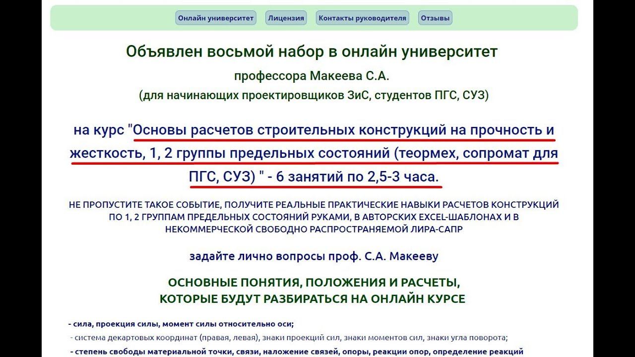 Онлайн университет проф. Макеева С.А. проводит онлайн курс https://makeev.justclick.ru/1402sopr2 "Основы расчетов строительных конструкций на прочность и жесткость, 1, 2 группы предельных состояний (теормех, сопромат для ПГС, СУЗ) " - 6 занятий по 2,5-3 часа. Начало занятий Первого потока 14 февраля, Второго 6, 7 февраля 2022 г. Приобрести записи всех онлайн занятий уже проведенного Первого потока можно на сайте https://makeev.justclick.ru/1402sopr2. На онлайн занятия Второго потока оплата принимается также на сайте. Про рассрочку платежа до 10 месяцев (от 890 руб./мес.) https://youtu.be/MVgho-ZKHGo. Ведущий проф. Макеев С.А. Оформить подписку на все мои бесплатные видео материалы по основам расчетов конструкций на прочность и жесткость можно на главной странице сайта онлайн университета https://sopromex.ru/ или на отдельных подписных страницах http://m1.sopromex.ru/, https://makeev.justclick.ru/podpiska_2020. Это более 25 часов полезного видео и ПК...