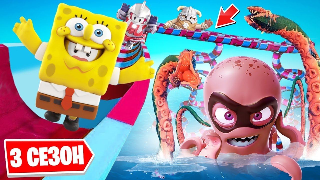 НОВЫЙ СЕЗОН В ФОЛЛ ГАЙC! СПАНЧ БОБ vs КРАКЕН! ОПАСНЫЙ АКВАПАРК С ЩУПАЛЬЦАМИ КРАКЕНА В FALL GUYS