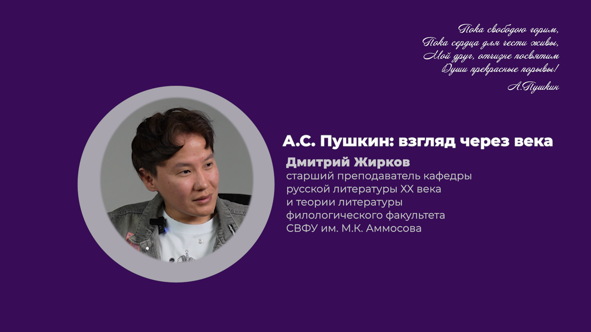 Сегодня, 6 июня, в России отмечается Пушкинский день. В заключительной серии видеолекций исследователей филологического факультета СВФУ, посвященных 225-летию Александра Сергеевича Пушкина, поговорим о влиянии поэта на молодежь XXI века. 🗣️Лекцию читает Дмитрий Жирков, старший преподаватель кафедры Русской литературы XX века и теории литературы филологического факультета СВФУ им. М.К. Аммосова.