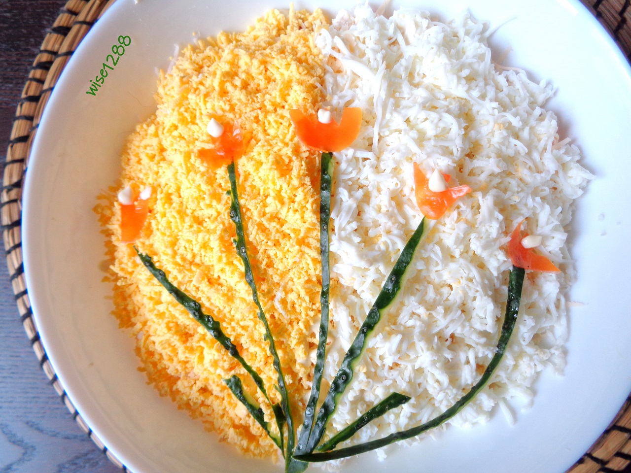 Салат выглядит привлекательно. Ингредиенты прекрасно гармонируют и дополняют друг друга. Желток и белок добавляют салату ярких красок, помидоры освежают вкус, и в комбинации с мясом и сыром получается достаточно сытная закуска. ИНГРЕДИЕНТЫ: • Свинина – 150 гр • Растительное масло – 1 стл • Приправа – 0,5 чл • Сыр – 130 гр • Помидоры – 2 шт • Майонез – 1,5 стл • Яйцо – 4 шт вареное • Огурец – 10 гр • Соль – 0,2 чл Пластик свинины ароматизировать приправой и обжарить на растительном масле до готовности. Охладить и нарезать на кусочки. Помидоры нарезать произвольно. Оставить небольшую часть помидора для оформления. Сыр нашинковать мелко. Яйца разделить на желток и белок. Натереть на терке отдельно желток и белок. Собрать салат: первым слоем в салатницу положить помидоры, нанести майонез, немного посолить. Затем положить свинину, нанести майонез. Третий слой – нашинкованный сыр, сверху нанести майонез. Завершающий слой – яйцо. Поверхность салата зрительно поделить на две половины. На одну половину распределить желток, на другую половину – белок. Посолить. Оформить салат на свое усмотрение. В данном салате для оформления использован огурец, помидор, майонез. ПРИЯТНОГО АППЕТИТА!!! Всем мира, бодрости духа и благополучия.