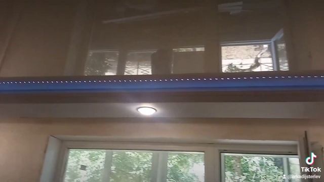 Натяжной Потолок и Гипсокартоновый Короб с Точечными Светильниками и Светодиодной Лентой