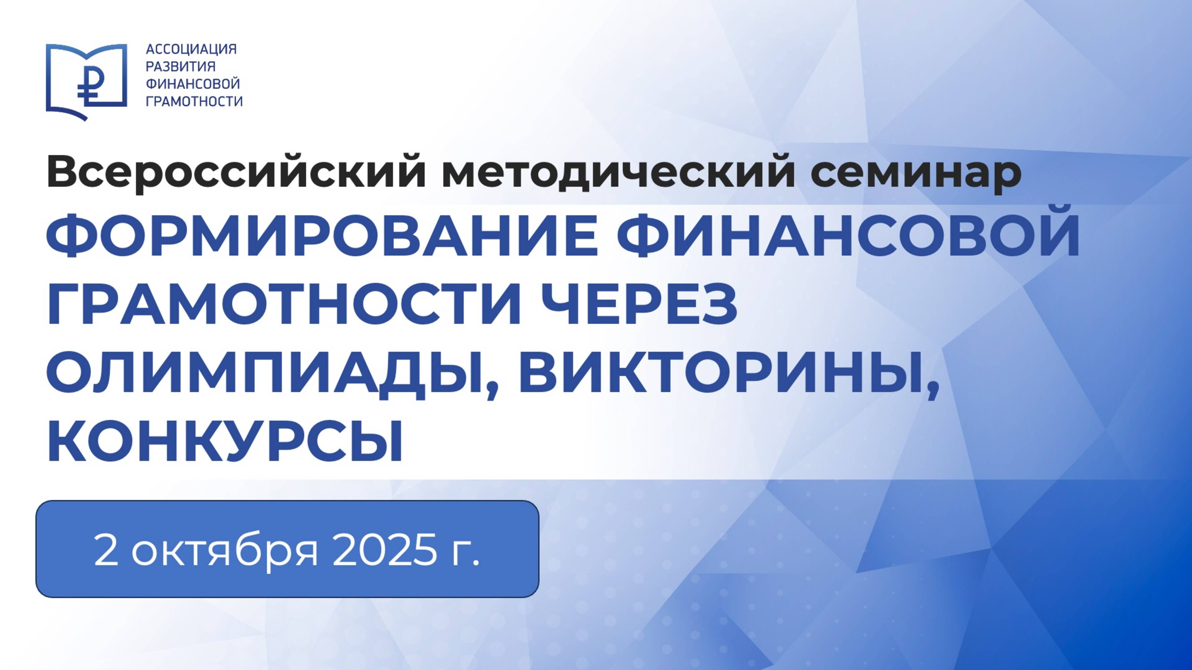 Модератор Андрианов Андрей Николаевич, заместитель генерального директора АРФГ Ссылка на ФинТренажер АРФГ https://fincubator.ru/fintrainer/finzachet2024/?utm_source=arfg&utm_medium=slide&utm_campaign=202509 Получить сертификат https://fincubator.ru/events/landings/?ELEMENT_ID=489092 ПРОГРАММА 10.00 – 10.05 – Открытие методического семинара по финансовой грамотности Андрианов Андрей Николаевич, заместитель генерального директора АРФГ 10.05–10.20 – Олимпиада «Высшая проба» Леушина Дарья Сергеевна, Заместитель начальника отдела: организации обучения педагогов, Центр «Федеральный методический центр по финансовой грамотности системы общего и среднего профессионального образования», Высшая школа экономики (г. Москва) 10.20–10.35 – Финспринт Осипова Нина Анатольевна, Руководитель программы «Финансовая грамотность» Благотворительного фонда «Вклад в будущее» (г. Москва) 10.35-10.50 – Международный чемпионат по финансовым играм Трушникова Светлана Сергеевна, Директор «ФинГрам» (г. Киров) 10:50-11:00 – ФинТренажер Андрианов Андрей Николаевич, заместитель генерального директора АРФГ (г. Москва) 11.05-11.10 – Ответы на вопросы участников семинара.