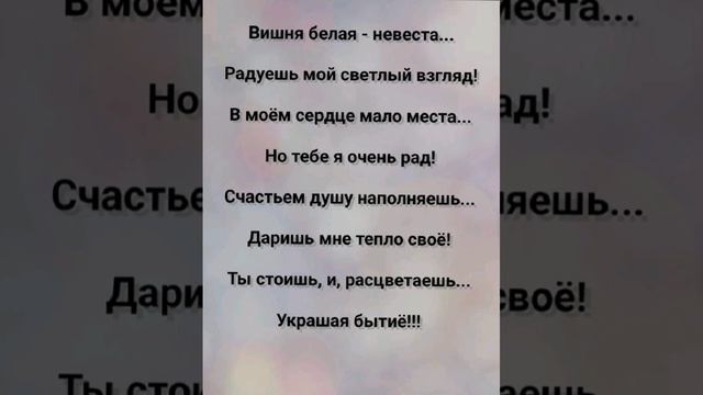 ХРИСТИАНСКИЕ ПЕСНИ ДЛЯ ХВАЛЫ ПОКЛОНЕНИЯ ПРОСЛАВЛЕНИЯ ЕВАНГЕЛИЗАЦИИ ДУХОВНОГО РОСТА ПРОБУЖДЕНИЯ ВОЗРОЖДЕНИЯ #господь#музыка#христианская_музыка#музика#христианскиепесни#бог#христианскиестихи#любовь#христианство#стихи#песня#песни#иисус#иисусхристос#иисусмойбог#иисус_христос#иисусбог#иисусгосподь#хвалы_и_поклонения#хваление#хвала#прославление#духсвятой#духовныйрост#духовноепробуждение#духовность#евангелие#евангелизация#евангельскаявесть#духовный_рост#пробуждение#рождество#рождествохристово#божий#божийнарод#божьеслово #ХристианскаяПесня #ХристианскоеПоклонение #ХристианскаяНоваяПесня #ПастырьМоейДушы #ХристианскаяМузыка #ПесняСлавы #Иисус #ЛюбовьБожья #ХристианскиеТексты #СлаваГосподу #ВераИПоклонение #ВечнаяЛюбовь #RussianChristianSong #RussianChristianWorship #RussianChristianMusic #RussianWorship #NewRussianChristianMusic #RussianChristianMusic #RussianSongOfPraise #Jesus #GodsLove #ChristianLyrics #GloryToGod #RussianFaithAndWorship #EternalLove #Пасха #Воскресение #ХристосВоскрес #пробуждение #возрождение https://stihi.ru/avtor/zhanna70 "ВИШНЯ БЕЛАЯ - НЕВЕСТА!" СЛОВА, МУЗЫКА, ОБРАБОТКА: ЖАННА ВОЛКОВА-ВАРЛАМОВА https://stihi.ru/2025/08/10/4428 Стихи Жанна Юрьевна Волкова-Варламова Вступление: Зацвела весною вишня... Прямо под моим окном. Радость Бога в сердце слышу... Чудеса весной Его я вижу!!! 1 Куплет Лепестки на ней, как иней... С нежной, хрупкой бахромой. Не найти её красивей... Этой раннею весной. Вся бела, как будто мелом... Кто-то кистью пробежал. Снегом мартовским, умелым... Её образ рисовал. Припев: Вишня белая - невеста... Радуешь мой светлый взгляд! В моём сердце мало места... Но тебе я очень рад! Счастьем душу наполняешь... Даришь мне тепло своё! Ты стоишь, и, расцветаешь... Украшая бытиё!!! 2 Куплет Ты стоишь и завлекаешь... Мой восторженный укор! Лето жаркое вещаешь... До осенних самых пор! Ветер ветви чуть колышет... Лепестками всё метёт! Моё сердце песню пишет... И, душа моя еë поёт! Бридж Белый цвет, как обещание Новых дней и тёплых встреч. Это первое свидание... Что так хочется сберечь! И, видя это чудо света... Я понимаю: всё пройдёт! И, злое сердце будет где-то... Прощение своё найдёт! Как ты цветешь, так и душа моя... Стремится к Свету...к Вечности Творца!!! Припев: Вишня белая - невеста... Радуешь мой светлый взгляд! В моём сердце мало места... Но тебе я очень рад! Счастьем душу наполняешь... Даришь мне тепло своё! Ты стоишь, и, расцветаешь... Украшая бытиё!!! 3 Куплет Этот цвет такой кристальный... Чистый, словно первый снег! Образ твой немного тайный... Ускоряет жизни бег. Ты стоишь, собой любуясь... Ветерок тебя ласкал! Я смотрю, душой волнуясь... Словно чуда долго ждал!!! Припев: Вишня белая - невеста... Радуешь мой светлый взгляд! В моём сердце мало места... Но тебе я очень рад! Счастьем душу наполняешь... Даришь мне тепло своё! Ты стоишь, и, расцветаешь... Украшая бытиё!!! 4 Куплет Весь мир вокруг преобразился... От этой нежной красоты! Как будто ангел опустился... Воплотив Божьи мечты! И, каждый лепесток - как Божий знак... Что жизнь прекрасна, а, Бог - велик!!! Бридж И, пусть промчатся дни и годы... И, отцветёт твоя краса... Я сохраню в душе своей те всходы... Что подарила ты, цветения пора! Ты - Божье творение... Душе - наслаждение! Припев: Вишня белая - невеста... Радуешь мой светлый взгляд! В моём сердце мало места... Но тебе я очень рад! Счастьем душу наполняешь... Даришь мне тепло своё! Ты стоишь, и, расцветаешь... Украшая бытиё!!! Заключение: Под моим окном невеста белоснежная стоит... И, на ней, как в к