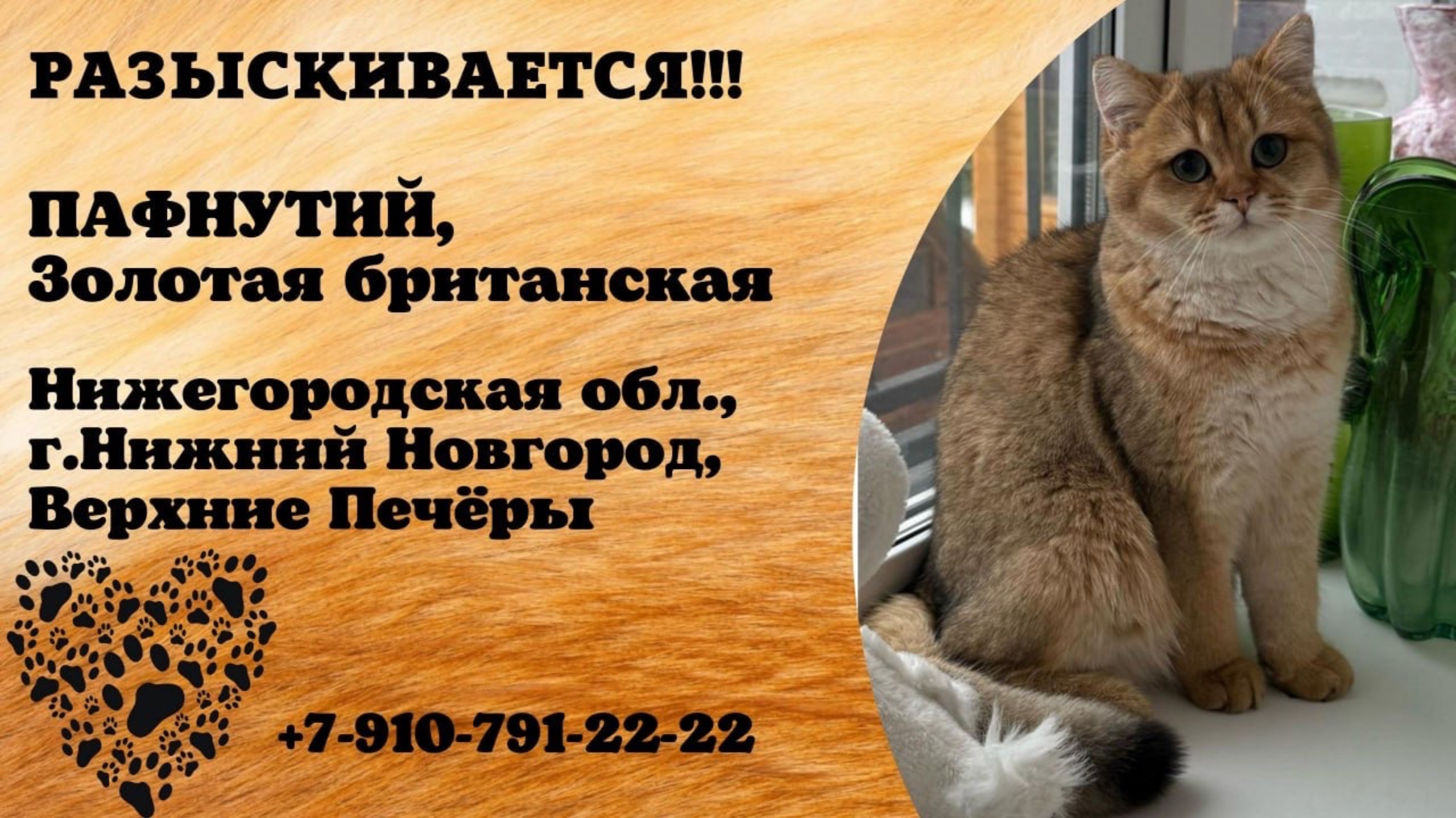 Нижегородская Нижний Новгород Пропал кот 11 февраля в Верхних Печёрах пропал кот Пафнутий , вышел погулять из частного дома на улицу. Прошу вас посодействовать в поиске нашего любимого котика. Порода - золотая британская. Окрас золотой тикированный, ny25,. Его видели последний раз в микрорайоне Верхние Печеры 11 февраля днём где-то рядом с Политехом, в ТСЖ Лагуна. Котёнку 8 месяцев, выглядит как обычный кот по размерам, не маленький. Кончик хвоста черный. Мы щедро отблагодарим (30 тысяч)того, кто найдёт нашего чудесного котика! Дети очень переживают. Места себе не находим! Вдруг его кто-то приютил, верните, пожалуйста Очень хотим найти его! Телефон для связи: 89107912222Заранее благодарю за помощь! Имя хозяина: Наталья Телефон: +7 910 791-22-22 Адрес: 123, Нижний Новгород Инфо https://vk.com/wall-198815410_179445 #пропал_кот#нижегородская#нижний_новгород