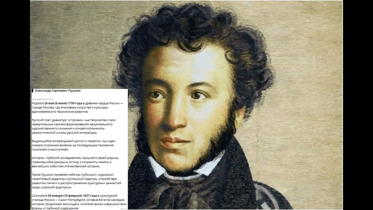 В краткой истории мы будем показывать героев истории. Спасибо за просмотр. Биография-Александр Сергеевич Пушкин (26 мая (6 июня) 1799, Москва — 29 января (10 февраля) 1837, Санкт-Петербург) — русский поэт, драматург и прозаик, заложивший основы русского реалистического направления, литературный критик и теоретик литературы, историк, публицист, журналист, редактор и издатель. Один из самых авторитетных литературных деятелей первой трети XIX века. Ещё при жизни Пушкина сложилась его репутация величайшего национального русского поэта. Пушкин рассматривается как основоположник современного русского литературного языка. Некоторые факты из биографии: С 1811 по 1817 годы учился в Царскосельском лицее. В 1814 году опубликовал в журнале «Вестник Европы» своё первое стихотворение «К другу-стихотворцу». Был членом литературных обществ «Арзамас», куда был принят ещё в Лицее, «Зелёная лампа». В 1820 году вышла в свет поэма Пушкина «Руслан и Людмила», имевшая огромный успех. В том же году за вольнодумные стихи (оду «Вольность» и некоторые эпиграммы) был отправлен в «южную ссылку». С 1824 года находился в ссылке в имении матери в селе Михайловское недалеко от Пскова. 2 марта 1831-го Александр женился на Наталье Гончаровой. У них было четверо детей (два мальчика и две девочки). 8 февраля 1837 года поэт дрался на дуэли с Дантесом. Был ранен, и умер 10 февраля 1837 года в возрасте 37 лет.