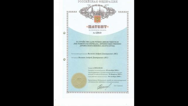 Патент №43810 учредителя ООО "Научфанпром" Валягина Андрея Дмитриевича