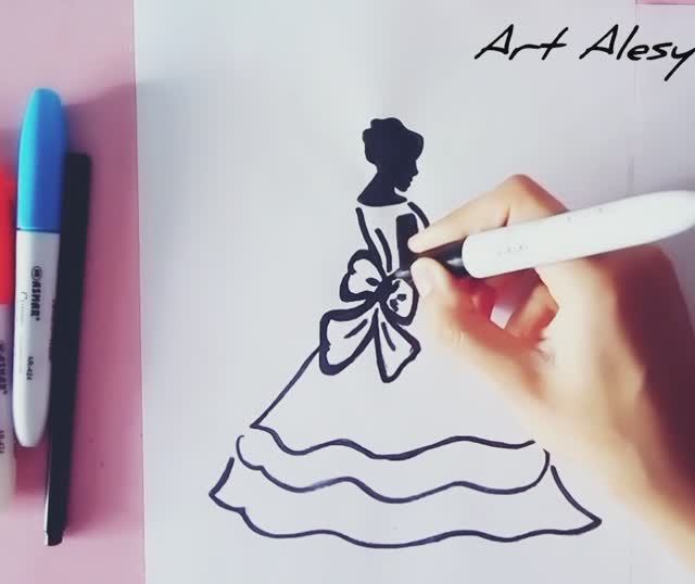 Рисую девушку в пышном белом платье чёрным маркером!🖤