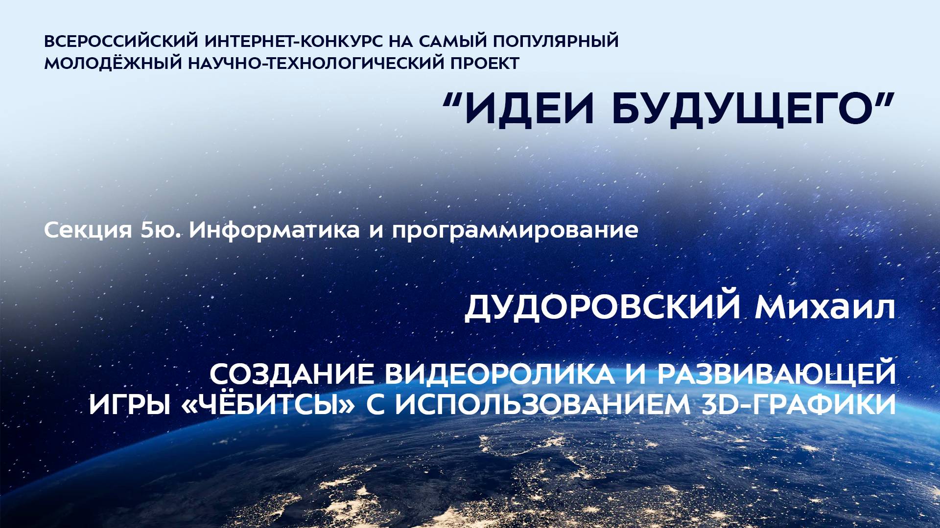 (5Ю-3) ДУДОРОВСКИЙ Михаил Владимирович Иркутская область, г. Иркутск МБОУ г. Иркутска СОШ № 77, 4 класс СОЗДАНИЕ ВИДЕОРОЛИКА И РАЗВИВАЮЩЕЙ ИГРЫ «ЧЁБИТСЫ» С ИСПОЛЬЗОВАНИЕМ 3D-ГРАФИКИ Научный руководитель: Павленко Ольга Михайловна, Иркутская область, г. Иркутск, МБОУ г. Иркутска СОШ № 77, учитель начальных классов Более подробно о мероприятиях Программы "Шаг в будущее" можно узнать на сайтах http://www.step-into-the-future.ru/ и http://шагвбудущее.рф