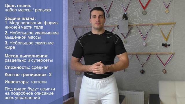 ТРЕНИРОВКА 1 Разминка 5-10 минут https://www.youtube.com/watch?v=AqpyR6vQvj0 1. Скручивания лёжа на полу 3х10-15 https://www.youtube.com/watch?v=ofV3K_cHx10 2. Приседания с гантелями 4-5х10-15 https://www.youtube.com/watch?v=UIcvBlo5Iqg 3. Выпады с гантелями 4-5х10-15 https://www.youtube.com/watch?v=rX4UI71ySxE 4. Боковые выпады 3х10-15 https://www.youtube.com/watch?v=zpkQM2i3xJI 5. Подъём таза лёжа 3х12-20 https://www.youtube.com/watch?v=-I9TNqAdEFo 6. Тяга гантелей в наклоне 3х10-15 https://www.youtube.com/watch?v=u7_af7jFb4g Жим гантелей стоя 3х10-15 https://www.youtube.com/watch?v=jCA_CTIET80 7. Отжимания от лавки сзади 3х10-15 https://www.youtube.com/watch?v=ba-0mdwPek0 Разводы с гантелями лёжа 3x10-15 https://www.youtube.com/watch?v=jNZL_pUwRhg Заминка (не обязательно) 2-5 минут https://www.youtube.com/watch?v=yM8WRIYeczA Тренировка 2 https://www.youtube.com/watch?v=Ew015qex3u4 Подробнее про этот план: https://tvoytrener.com/doma/doma_devysski_nogi.php Цель плана: рельеф или набор массы Задачи плана: 1. Моделирование формы нижней части тела 2. Небольшое увеличение мышечной массы 3. Небольшое сжигание жира Методы выполнения: суперсеты | раздельно Сложность – средняя Этот план от других отличается по большей части тем, что в обеих тренировках мы основательно грузим ваши бёдра и ягодицы. Причём метод выполнения упражнений – комбинированный. Это значит, что первую часть тренировки (для ног и ягодиц) мы делаем раздельным методом. А вторую часть (для верхней части тела) – суперсетами. Это делается для того, чтобы не дать вашей верхней части тела обрасти слишком большими мышцами. Кроме того, это придаст тренировке некоторый жиросжигающий эффект. Суперсет, это два упражнения под одной цифрой. Например, делаете 1 подход тяги гантелей в наклоне, затем сразу без отдыха делаете 1 подход жима гантелей стоя. Затем отдых примерно 2-3 минуты и повторяете всё заново. И так пока не сделаете 3 таких подхода. Потом переходите к следующей паре упражнений. Хочу ещё добавить, что этот комплекс не обладает ярко выраженным жиросжиганием. Он предназначен в основном для того, чтобы моделировать форму вашего тела, не меняя при этом ваш вес. Если же вы просто хотите в целом похудеть – посмотрите этот комплекс. Ну и как в большинстве моих домашних тренировочных планов вам понадобятся только гантели. Лучше разборные. Или весом в 3, 5, 7, 10 кг (примерно).