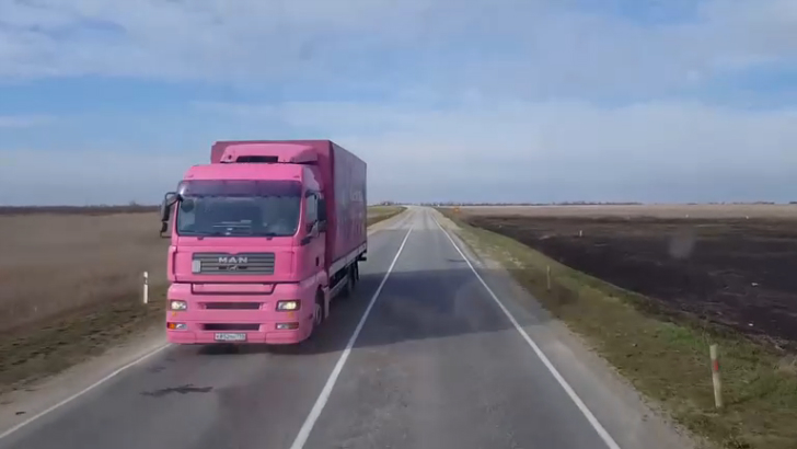 Выезжаю из Евпатории на загрузку в Армянск,... встречаю свой любимый розовый Ман,.... удачно гружусь и еду в Керченский накопитель на паром в старом аэропорту...., в кадр попала девушка лёгкого поведения... покупаю билет на паром и еду в порт для переправы.