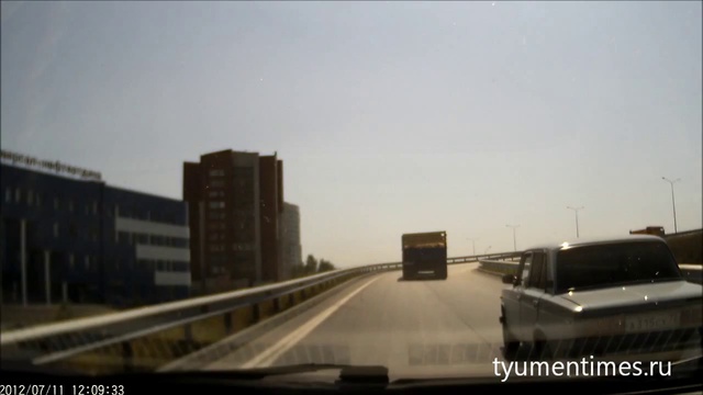 Это происшествие было снято на регистратор в г. Тюмень (Россиия), на Червишевском тракте. В повороте из прицепа грузовика выпала свинья.