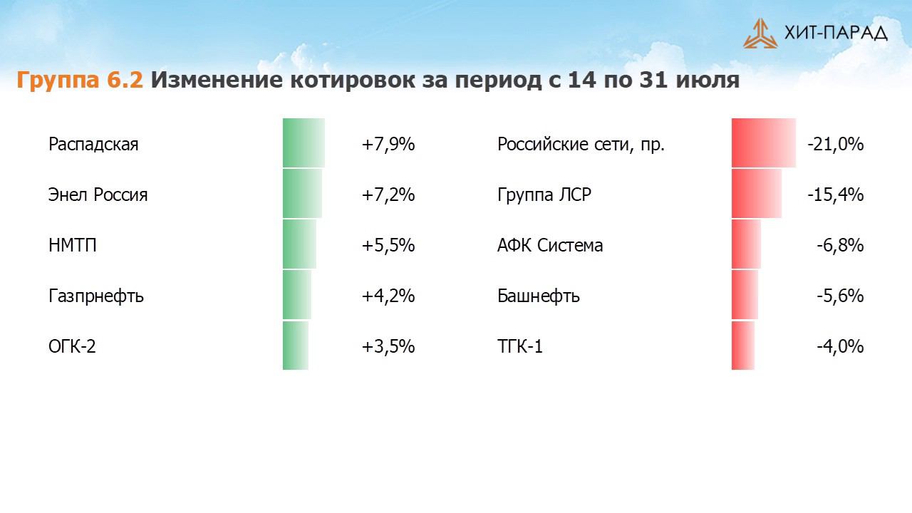 Аналитик по акциям УК "Арсагера" Артём Абалов в традиционном обзоре торгов на российском рынке акций "Хит-Парад" за период с 17 июля по 28 июля 2017 года. За прошедшие 2 недели индекс ММВБ снизился на 2,2% до отметки 1 916 пунктов. Активность операторов рынка в отчетном периоде находилась на среднем уровне. Посмотрим, кто стал лидерами роста и снижения в разрезе традиционных групп акций. Отметим, что в отчетном периоде по акциям ряда крупных компаний были закрыты реестры для целей выплаты годовых дивидендов. Группа 6.1 Пятерку лидеров возглавили акции Норильского никеля, прибавившие свыше 4%; возможно, инвесторы таким образом отреагировали на продажу своего пакета акций группой «Металлоинвест». Акции Сбербанка прибавили 2,5% в ожидании публикации полугодовых результатов. Динамику лучше рынка показали акции Мегафона, ФосАгро и РусГидро на фоне отсутствия значимых корпоративных событий. Пятерку аутсайдеров возглавили акции АЛРОСы, потерявшие более 13% после закрытия реестра для целей выплаты дивидендов. Аналогичная причина обусловила падение акций Газпрома и ФСК. Компанию им составили бумаги Лукойла и ВТБ, показавшие динамику хуже рынка без особых корпоративных новостей. Возможно, акции, имеющие внушительный вес в индексе, стали жертвами распродаж со стороны иностранных инвесторов на фоне очередного обострения напряженности между Россией и рядом западных стран. Группа 6.2 В группе 6.2 лидером роста стали акции Распадской, прибавившие около 8% на фоне роста полугодовых операционных результатов. Акции Энел Россия прибавили более 7% на фоне публикации сильных финансовых результатов по итогам полугодия, отразивших пятикратный рост чистой прибыли. Бумаги НМТП выросли на 5,5% после решения суда, признавшего компанию невиновной в установлении монопольно высокой цены на услуги по перевалке ряда грузов. Акции Газпром нефти выросли на 4,2% на фоне публикации полугодовых финансовых результатов, отразивших внушительный рост чистой прибыли. Та же причина лежит в основе роста котировок акций ОГК-2, чья прибыль по российским стандартам учета выросла в 2,5 раза. Пятерку аутсайдеров возглавили префы Российских сетей после закрытия реестра для целей выплаты дивидендов. Компанию им составили акции Группы ЛСР, потерявшие более 15% на новостях о скромных операционных результатах за полугодие и возможном уменьшении дивидендных выплат по итогам текущего года. Бумаги АФК Системы продолжают находиться под давлением судебного процесса с Роснефтью. Среди аутсайдеров также акции Башнефти и ТГК-1, показавшие динамику хуже рынка без особых корпоративных новостей. Группа 6.3 В группе 6.3 пятерку лидеров возглавили акции сетевых компаний – МРСК Центра и Приволжья и МРСК Волги – прибавившие по 30%: инвесторов воодушевляют предварительные итоги деятельности компаний за полугодие, фиксирующие существенный рост чистой прибыли. Как следствие, по итогам года данные бумаги могут обещать своим держателям весомые дивидендные выплаты. Схожие причины обусловили рост привилегированных акций Ленэнерго, прибавивших более 14%, а также префов Саратовского НПЗ, выросших на 12,6%. Бумаги КТК прибавили свыше 16% на фоне отсутствия значимых корпоративных событий. В пятерке аутсайдеров представлены акции банка Санкт-Петербург, упавшие на 9% после оглашения цены допэмиссии 53 рубля за ак