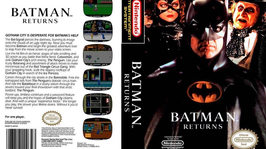 Знаменитая Konami создала боевик по кинофильму Batman Returns, перенеся в игру события оттуда. Многочисленные заставки, Человек-Пингвин и Женщина-Кошка прилагаются. Бэтмен раскидывает врагов в стороны кулаками и ногами, время от времени используя бэтаранги и гарпун. В одном из уровней вы едете на бэтмобиле, а ещё в одном - летите на бэтолёте. В игре местами приятные анимации окружения, однако фоны бледноватые и не вдохновляющие. На уровне 3-1 не спешите лезть в первое окно, пройдите чуть дальше, до второго. Там вначале победите зелёных чертей, а потом разбейте люстру - дадут постоянное пополнение здоровья. Трудная игра с простенькой боевой системой.