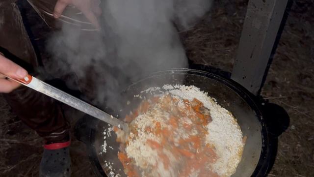 Приготовление плова в казане печка которая покупается вместе с казаном.