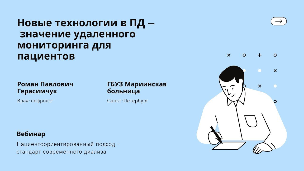 Новые технологии в перитонеальном диализе (ПД) – значение удаленного мониторинга для пациентов. Роман Павлович Герасимчук. Санкт-Петербург. Врач-нефролог отделения диализа Мариинской больницы. Кандидат медицинских наук, ассистент кафедры внутренних болезней и нефрологии Северо-Западного государственного медицинского университета им. И.И.Мечникова (с 2014 года). Вебинар 27 апреля 2021 Нас можно найти: Сайт ‒ https://nephroliga.ru/ ------------------------------------------------------------------------------------------------- Facebook ‒ https://www.facebook.com/nephroliga.ru/ ------------------------------------------------------------------------------------------------- Instagram ‒ https://www.instagram.com/nephroliga/ ------------------------------------------------------------------------------------------------- Трансплантация? Я – за! ‒ https://donor4life.ru/ ------------------------------------------------------------------------------------------------- TransplantNet ‒ https://xn--80aa6ahcjekfi.net/info ------------------------------------------------------------------------------------------------- VK ‒ https://vk.com/nefropravo -------------------------------------------------------------------------------------------------