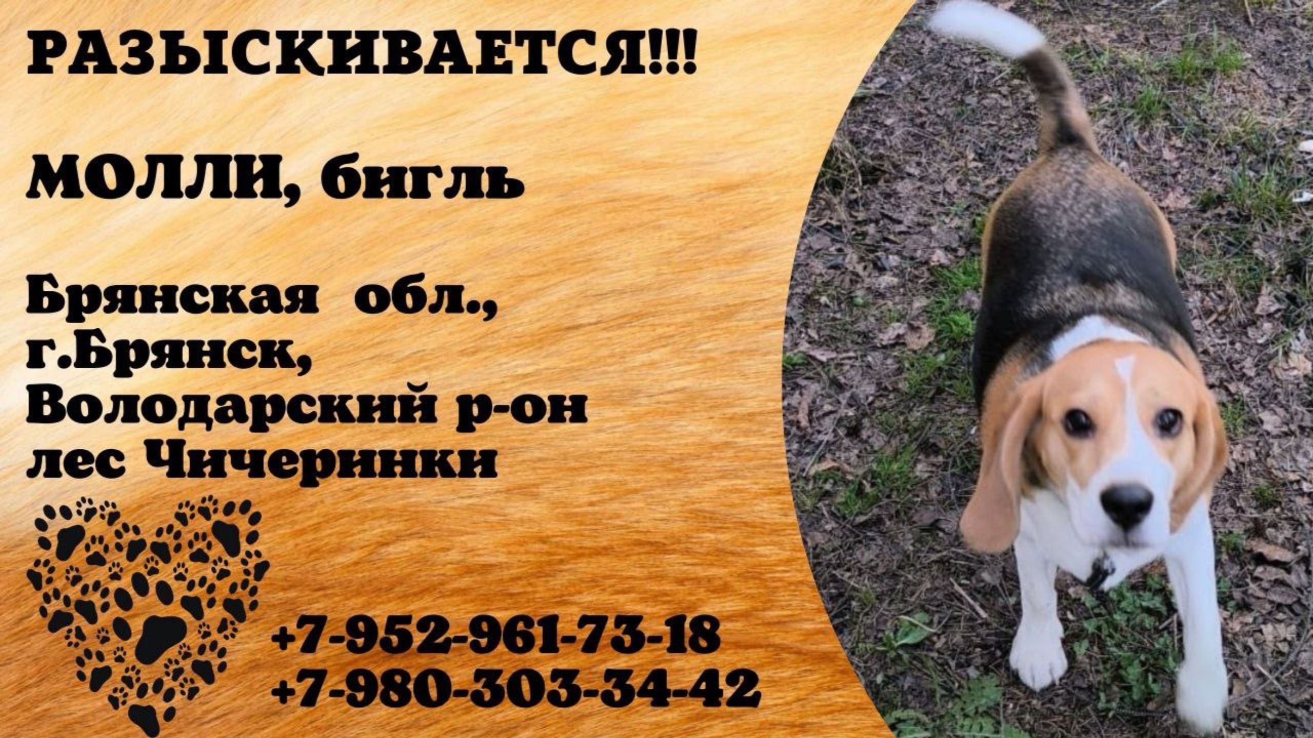 Пропала собака! МОЛЛИ, бигль. Брянская обл., г.Брянск.