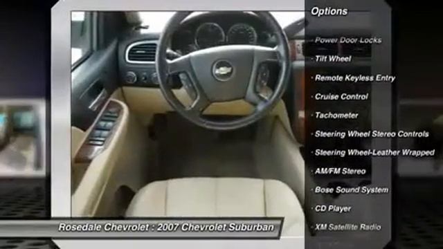 2007 Chevrolet Suburban LT http://www.RosedaleChev.com For more information on this vehicle and our full inventory, call us at 612-260-4887 Rosedale Chevrolet 2845 Interstate 35 W Roseville MN 55113 Leather Seats, 3rd Row Seat, DVD, 4x4, Running Boards, Onboard Communications System, Heated Mirrors, Rear Air, Alloy Wheels, ENGINE, VORTEC 5.3L V8 SFI FLEX-FUEL, Tow Hitch, Edmunds Consumers' Most Wanted SUV Under $45,000 READ MORE!======THIS SUBURBAN IS EQUIPPED WITH PREMIUM FEATURES: LT PREFERRED EQUIPMENT GROUP Includes (CJ2) Air conditioning, dual-zone automatic climate control, (US9) Audio system, AM/FM stereo with MP3 compatible 6-disc in-dash CD changer, (JF4) Pedals, power-adjustable, (AP3) Remote vehicle starter system, includes Remote Keyless Entry, (A95) Seats, front bucket with leather-appointed seating, (AM8) Seats, second row 60/40 split-folding bench with leather-appointed seating, (AW2) Seats, third row 50/50 split-bench with vinyl, 2-passenger, (UG1) Universal Home Remote, (UD7) Rear Parking Assist, Ultrasonic, ENTERTAINMENT SYSTEM, REAR SEAT DVD PLAYER with remote control, overhead display, 2 sets of 2-channel wireless infrared headphones and auxiliary audio/video input jacks, ENGINE, VORTEC 5.3L V8 SFI FLEX-FUEL with Active Fuel Management, capable of running on unleaded or up to 85% ethanol (310 hp [231.1 kW] @ 5200 rpm, 335 lb-ft of torque [452.3 N-m] @ 4400 rpm), aluminum block (STD), AUDIO SYSTEM, AM/FM STEREO with MP3 compatible CD/DVD player, seek-and-scan, digital clock, auto-tone control, Radio Data System (RDS), speed-compensated volume, TheftLock and 2 slots, upper slot is for DVD/CD/MP3 and lower slot is for CD/MP3 only ======NOW IS THE TIME TO OWN THIS SUBURBAN: Reduced from $19, 562. ======KEY FEATURES ON THIS SUBURBAN INCLUDE: Heated Mirrors, 4x4, Rear Air, Running Boards, Onboard Communications System Rear Seat Audio Controls, Privacy Glass, Steering Wheel Controls, Electronic Stability Control, Electrochromic rearview mirror. Pricing analysis performed on 3/1/2014. Horsepower calculations based on trim engine configuration. Please confirm the accuracy of the included equipment by calling us prior to purchase.