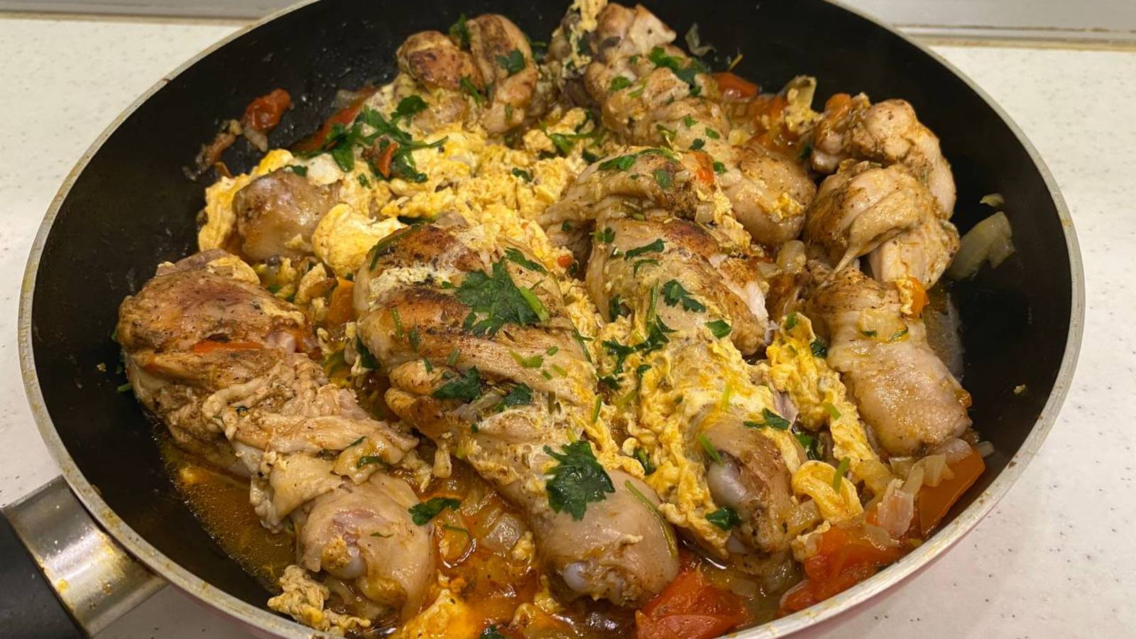 Отличный рецепт куриных ножек с помидорами и яйцами!